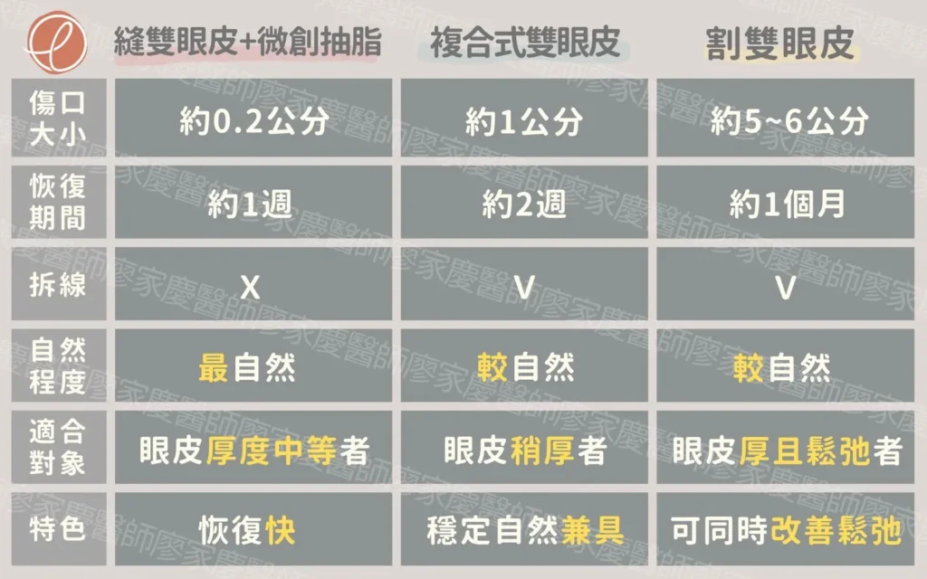 複合式雙眼皮是一種結合「切開式」與「縫合式」的雙眼皮技術,這種手術會在眼皮上做小範圍切開,移除適量的脂肪,再搭配縫線固定雙眼皮摺痕,適合希望雙眼皮效果自然,又能改善眼皮脂肪稍多的人。相較於割雙眼皮此種方式傷口較小、恢復較快,同時比單純縫雙眼皮更穩定、不易鬆脫。